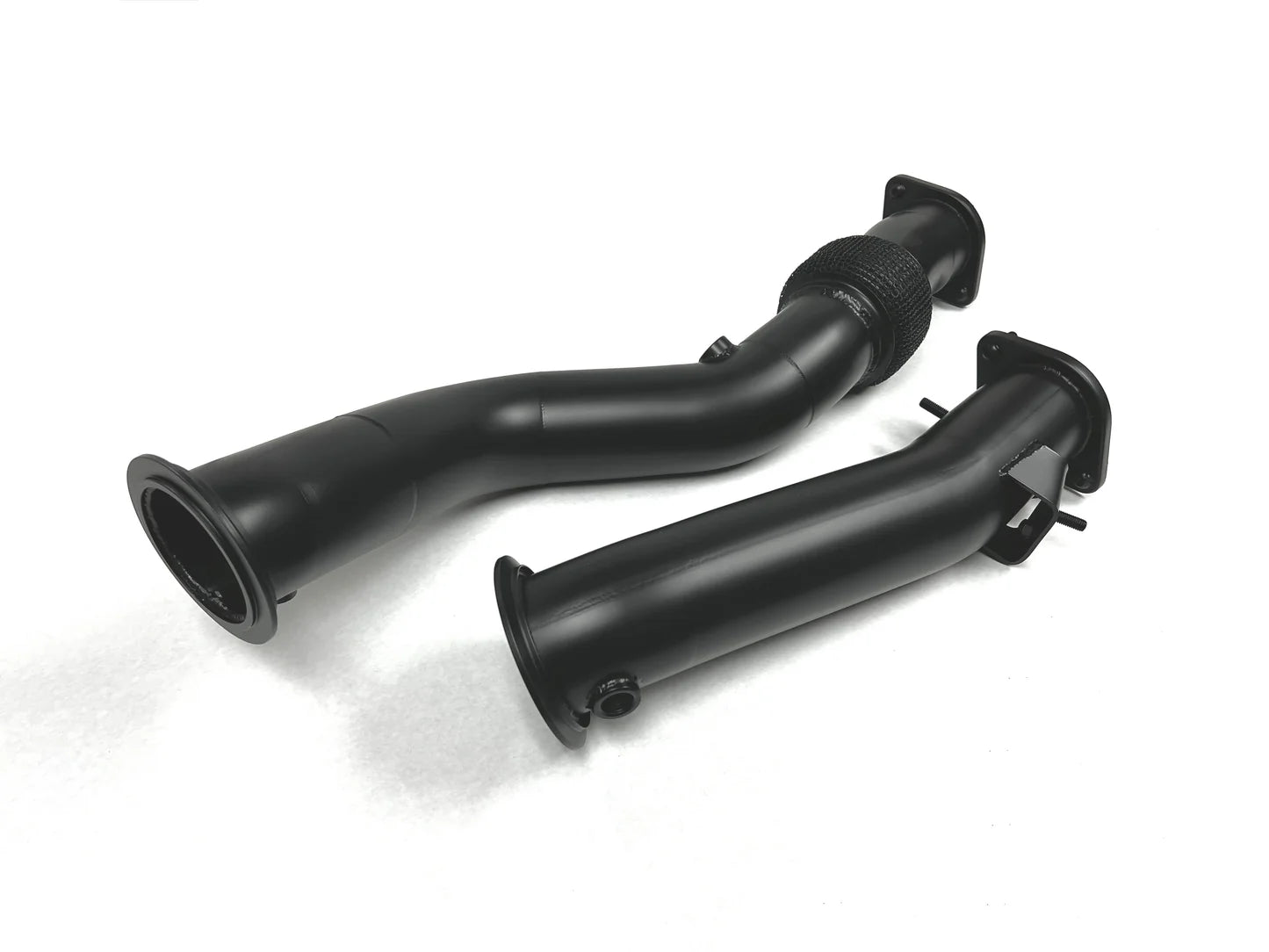 Our downpipes are designed to fit perfectly with either the factory exhaust system or your aftermarket exhaust system. There are no compatibility issues whatsoever. The downpipes will come by default with brushed finish.