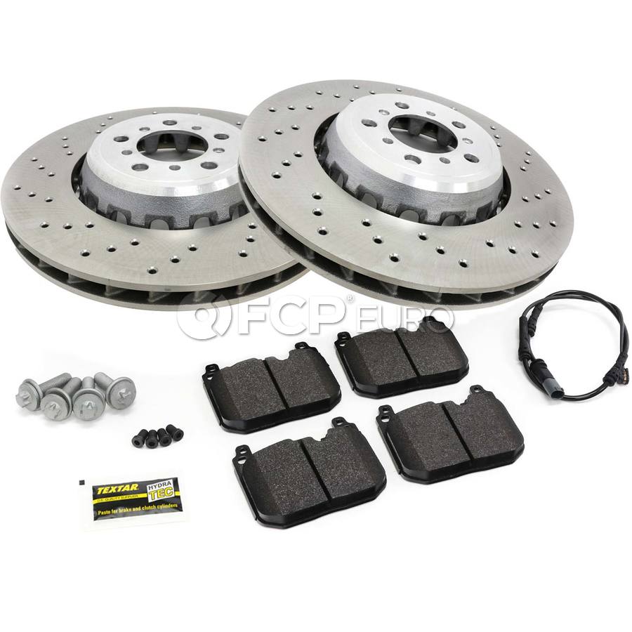 Rear brake kit featuring SHW Performance brake rotors, Hawk Performance Ceramic Z-compound brake pads, rotor set screws, brake pad wear sensor, caliper bolts, and anti-squeal brake paste.